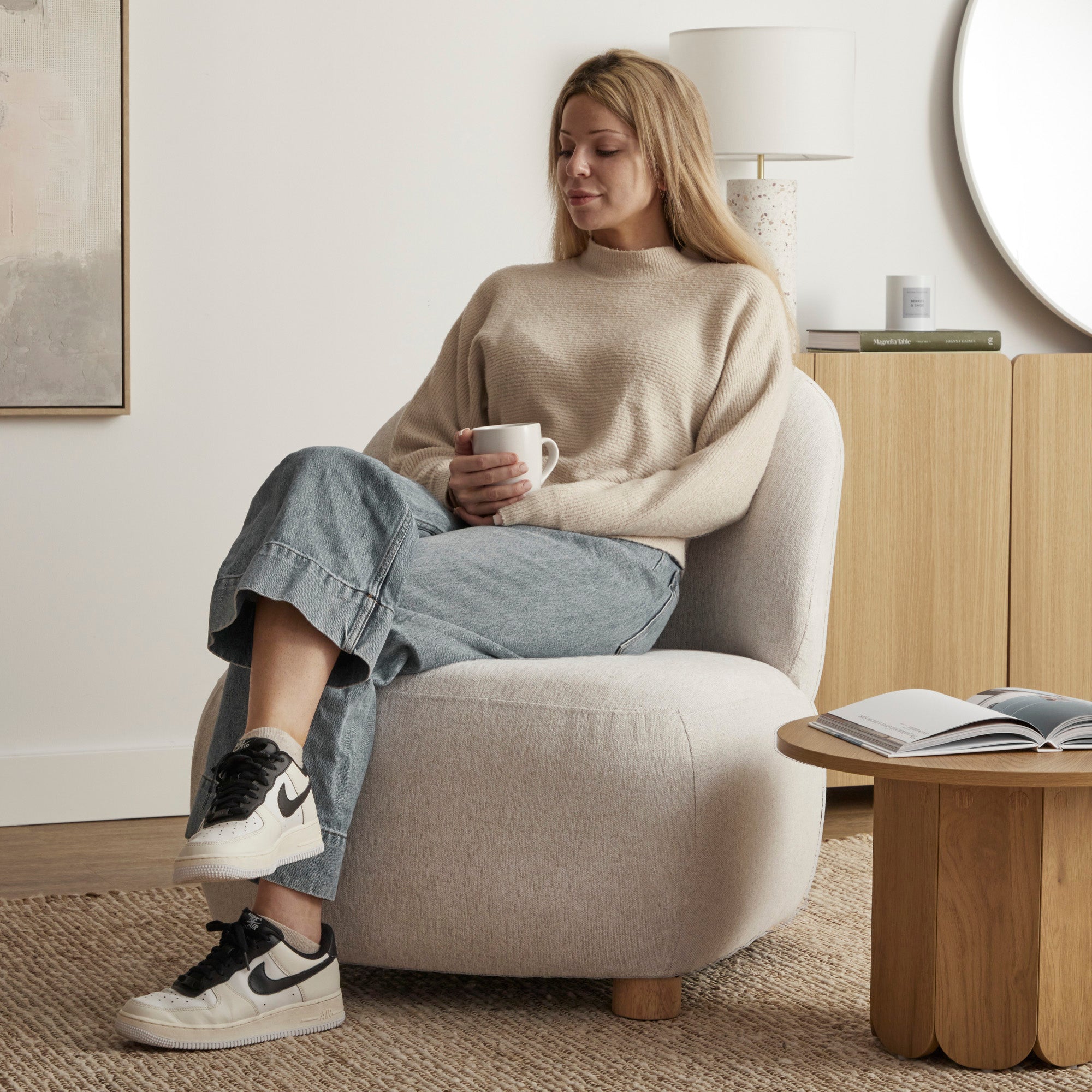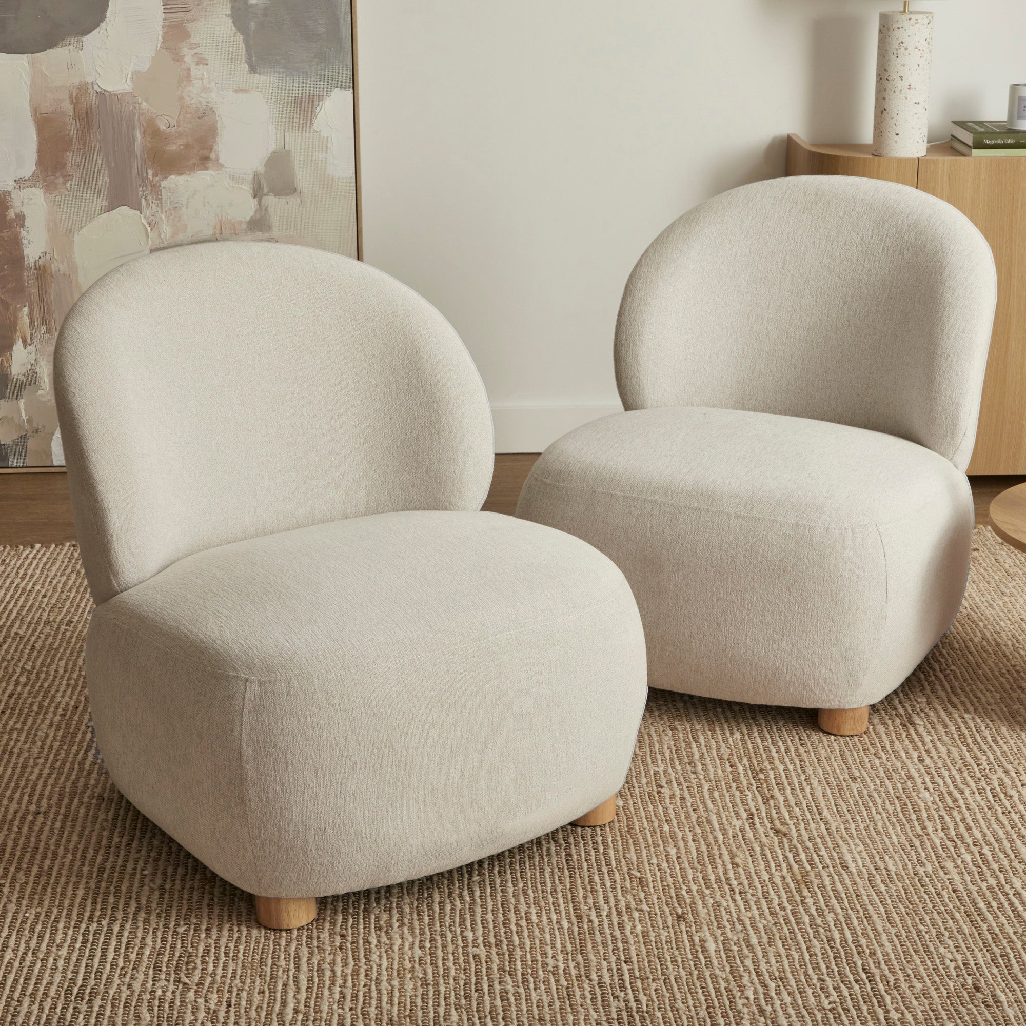 The Cooper & Co. Wynn Accent Chair (Set of 2) in Cream offers a soft, sculptural look with low-profile design and rounded curves. Upholstered in plush, textured fabric, this pair brings warmth and comfort into bedrooms, lounges, or reading corners. Each chair features a fully cushioned form and natural rubberwood base, combining a relaxed feel with everyday function.